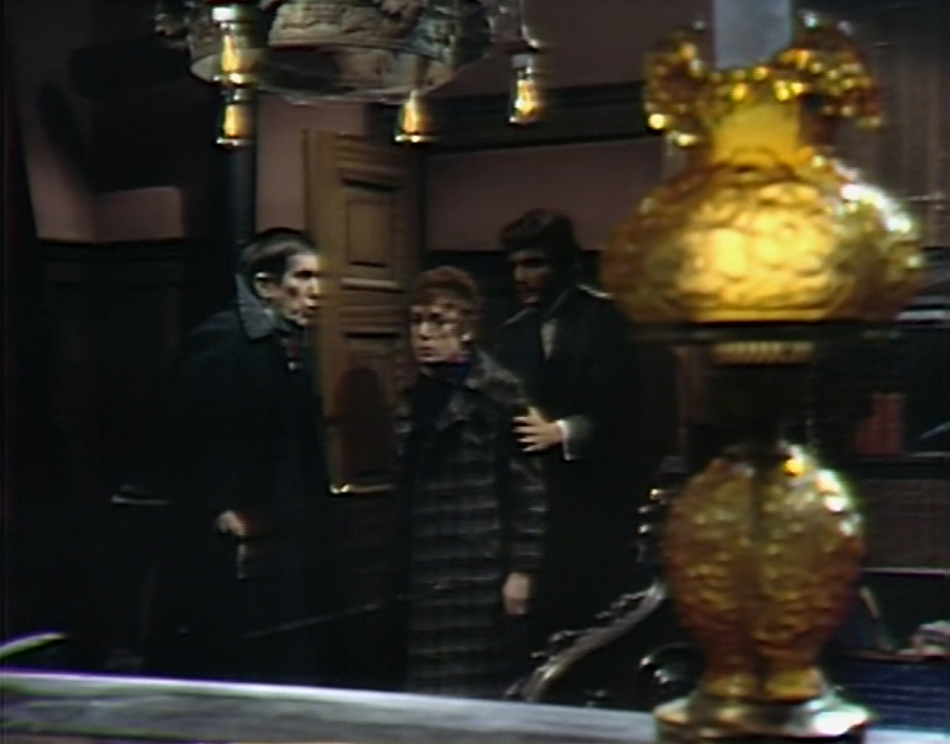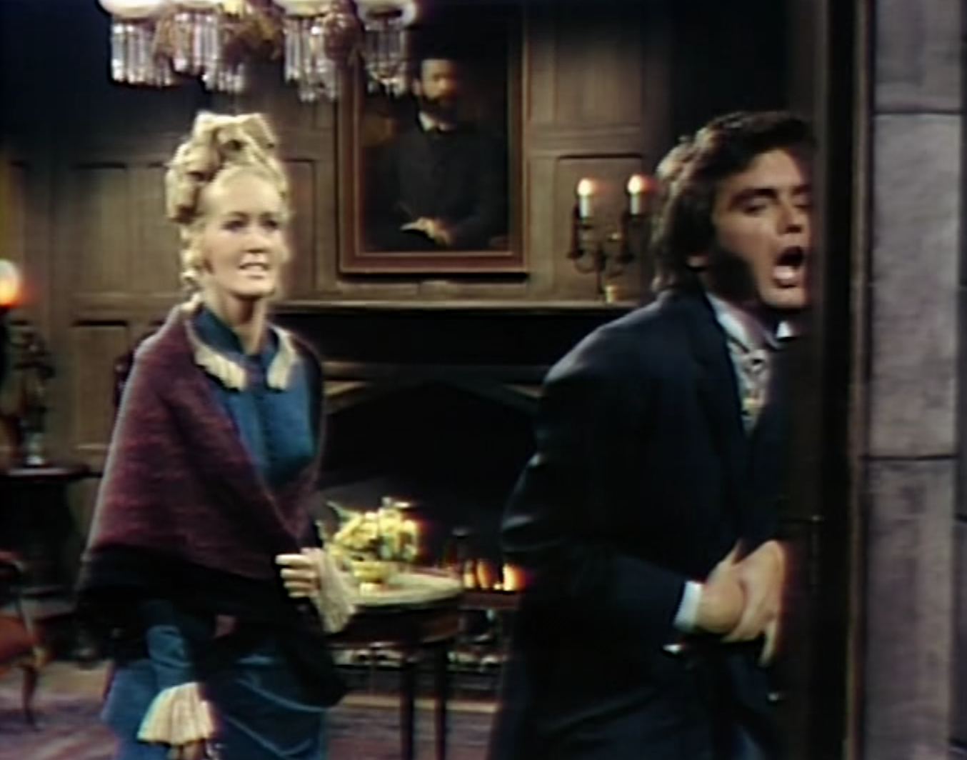 Vicki hugs Elizabeth and Maggie appears dazed. Vicki sees Barnabas and recoils. Julia looks from Barnabas to Vicki. Barnabas stares at Vicki.