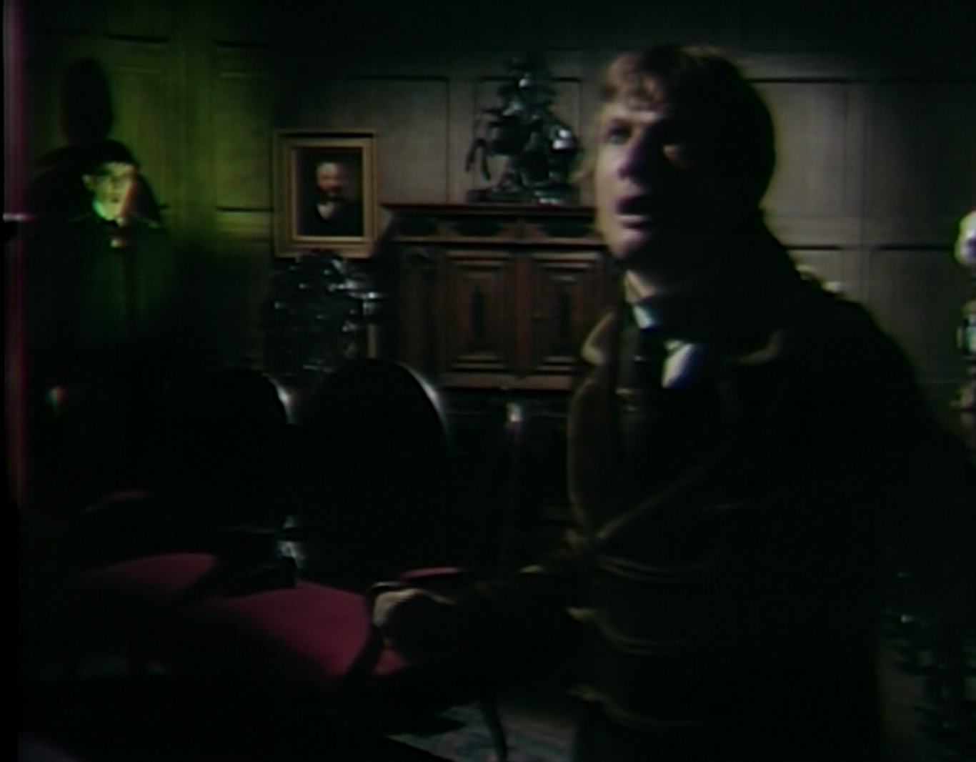 Carl returns to Collinwood and tries to phone for help. A bat flaps outside the drawing room window. The shutters suddenly swing open. Carl asks who's there, and the drawing room doors slam shut. He runs to the windows, which are now closed.